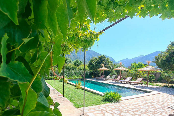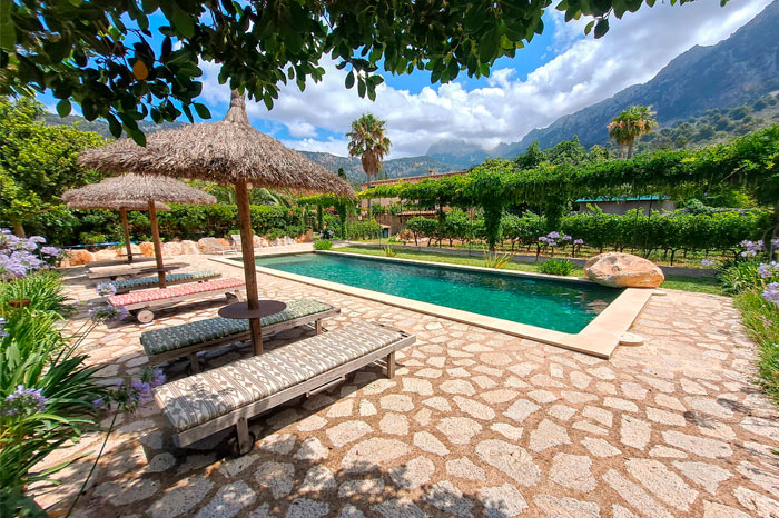 Stunning restored Mallorcan Finca from 1889, at only 2 km from the center of Sóller with a large garden and pool. The house sleeps 8 and has 4 double bedrooms and 3 bathrooms, large dining room and a fully equipped kitchen. The large covered barbeque and sitting area overlooking the garden is our renter’s favorite place. The garden offers different sitting areas among the trees and fruit trees, lemons, oranges, peaches, apples, cherries,...even a small vineyard!